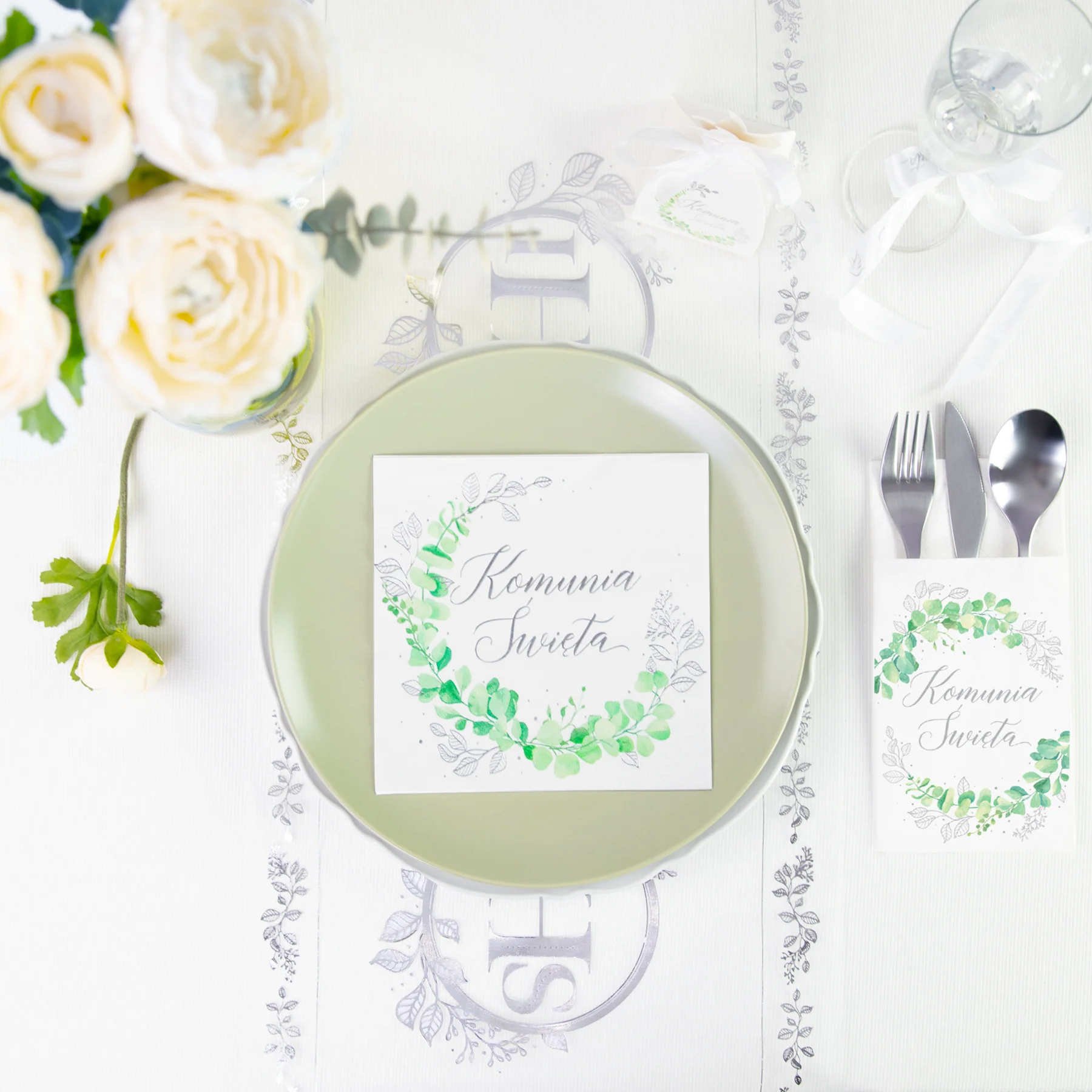 Serwetki doskonale komponują się z innymi dekoracjami z kolekcji Eukaliptus srebrny, tworząc spójną i elegancką aranżację komunijnego stołu – zarówno w domu, jak i w lokalu.